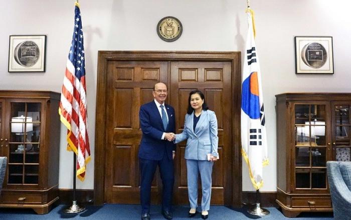 유명희 산업통상자원부 통상교섭본부장이 미국 경제통상 인사들을 만나 일본 수출규제 조치의 부당성을 알렸다.▲ 유명희 산업통상자원부 통상교섭본부장(오른쪽)이 윌버 로스 미국 상무장관과의 면담 후 기념촬영을 하고 있다.미국 의회·업계 인사와 전문가들은 경제와 안보에 미칠 부