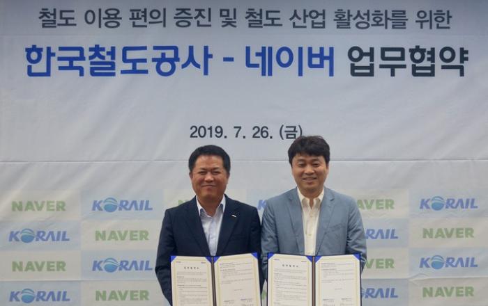 코레일이 26일 오후 서울사옥에서 네이버와 철도 승차권 예매 서비스 개선을 위한 업무협약을 체결했다고 밝혔다.협약식에는 이선관 코레일 고객마케팅단장, 이건수 네이버 Glace CIC 대표 등이 참석했다.이번 협약으로 네이버는 코레일의 열차표를 홈페이지나 앱에서 바로 예