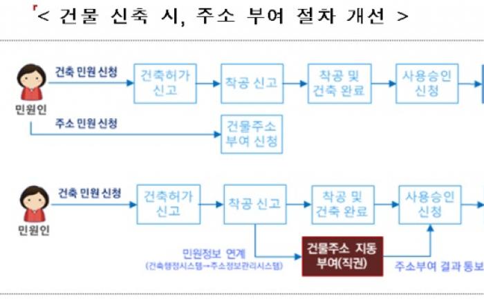 올해 하반기부터는 건축물 신축 시, 건축주가 자치단체 건축 담당부서와 주소 담당부서에 각각 민원을 신청해야 하는 불편함이 사라진다. 국토교통부와 행정안전부는 건축물 신축 시 착공신고가 완료되면 건축주가 신청하지 않아도 자치단체가 알아서 건물주소를 부여하도록 업무절차 및