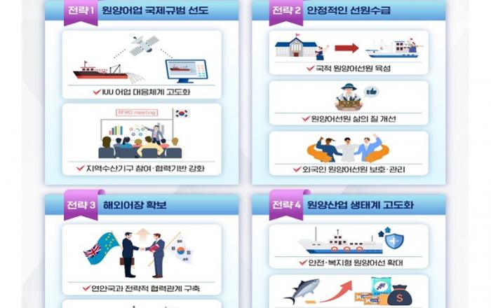 세계 원양산업을 선도하는 모범국가로 도약하기 위한 5년 동안의 청사진이 마련됐다. 이에 불법·비보고·비규제(IUU) 어업 대응체계를 고도화하며, 어선에 승선하는 수산계 고교 재학생에 취업준비금 등을 우선 지원하고, 해양수산연수원의 어선 해기사 교육생에게 생활비 등을 지