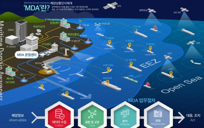 해양경찰청은 “미래형 첨단 해양경비체계 마련을 위해 한국형 해양상황인식체계(MDA) 플랫폼 구축 3년 차 사업을 진행하겠다.” 고 19일 밝혔다. 해양상황인식체계(MDA)란 해양에서 발생하는 모든 상황을 실시간으로 파악하여 우리나라의 안보·안전·경제·환경 등에 미치