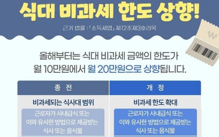 이번 연말정산부터는 식대 비과세 한도가 월 20만원으로 상향되고, 영화 관람료도 30%의 공제율이 적용된다. 법제처는 이러한 내용을 포함해 2023년 달라지는 세법의 개정 사항들과 꼭 알아 두어야 하는 세액공제, 소득공제 관련 법령들을 11일 소개했다. (자료=법
