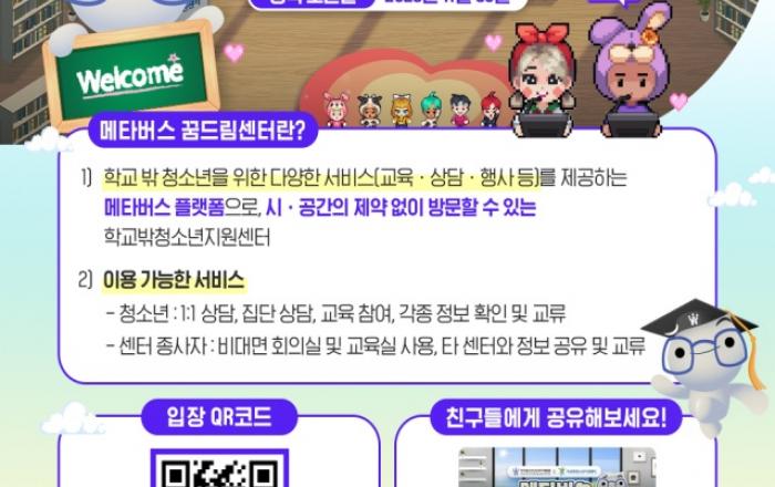 여성가족부와 한국청소년상담복지개발원은 30일 학교 밖 청소년에게 언제 어디서나 서비스 제공이 가능한 가상공간(메타버스) 학교밖청소년지원센터(꿈드림센터)의 문을 연다고 밝혔다. 학교 밖 청소년이라면 누구나 시·공간 제약 없이 비대면으로 서비스를 받을 수 있는 메타버스 꿈