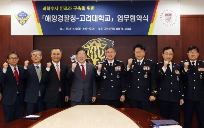 해양경찰청과 고려대학교는 오늘 오전 고려대학교 본관 1층 회의실에서‘해양과학 수사역량 강화 및 인프라 구축을 위해’ 업무협약(MOU)을 체결했다.”고 28일 밝혔다.주요 업무협약 내용으로는 ▲ 정보보호대학원과 디지털포렌식 교육·학술 분야 상호교류 ▲ 의과대학(법의학교실