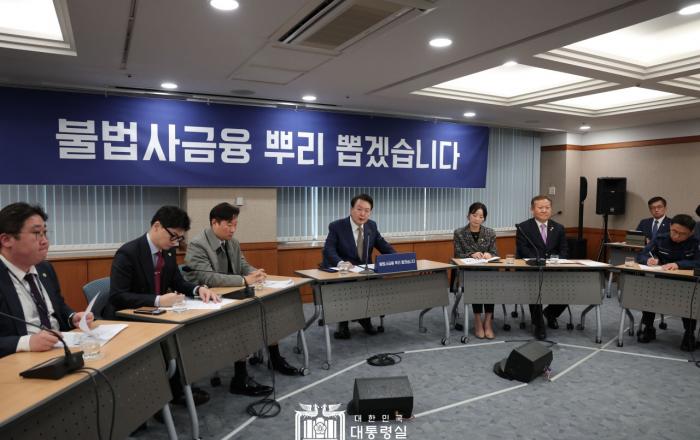 윤석열 대통령은 9일 불법사금융 대응과 관련, “약자의 피를 빠는 악질적 범죄자들은 자신이 저지른 죄를 평생 후회하도록 강력하게 처단하고, 범죄수익은 차명 재산까지 모조리 추적하여 환수해야 한다”고 강조했다. 대통령은 이날 금융감독워에서 열린 ‘불법사금융 민생현장 간담