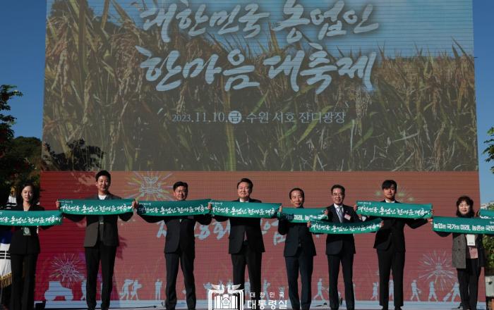윤석열 대통령은 10일 ‘제28회 농업인의날 기념식’에서 농업인의 소득 안정을 위해 농업직불금을 임기 내 5조 원까지 확대하고 해외순방마다 우리 농산물과 농업기술을 해외에 알리고 새로운 시장을 적극 개척해 나가겠다고 약속했다. 수원 서호 잔디광장에서 개최