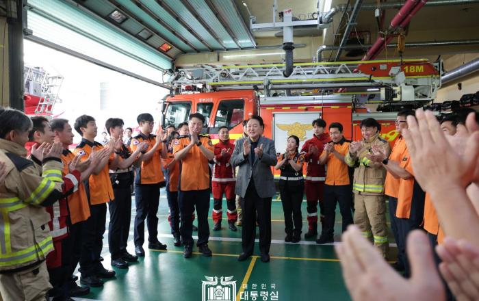 윤석열 대통령은 9일 ‘제61주년 소방의 날 기념식’에 참석해 국민안전을 지키기 위해 자신의 몸을 아끼지 않는 소방대원들의 안전과 복지를 위한 아낌없는 지원을 약속했다. 서울 용산어린이정원 잔디마당에서 열린 기념식은 대통령이 최일선 재난 현장에서 국민의 안전을 위