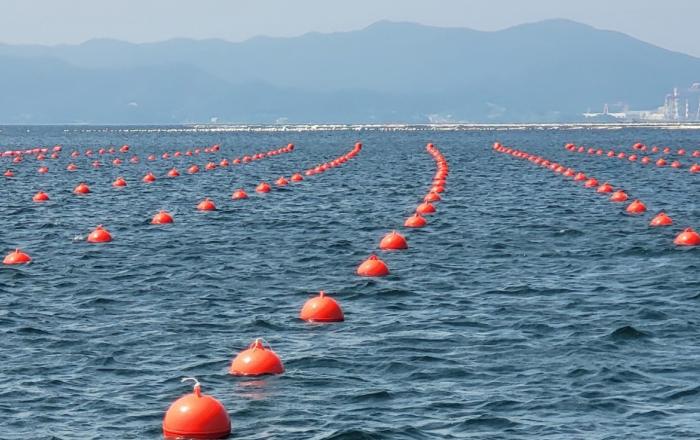 해양수산부는 해양 미세플라스틱 발생의 주요 원인으로 지적돼온 스티로폼(발포폴리스티렌)이 포함된 부표의 신규 설치를 오는 13일부터 모든 양식 어장에서 전면 금지한다고 8일 밝혔다. 설치된 인증부표어장. (사진=해양수산부) 개정된 ‘어장관리법 시행규칙’에 따라 김, 굴