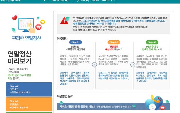 국세청은 31일 2000만 근로자의 편리한 연말정산을 위해 더욱 개선된 ‘연말정산 미리보기’와 ‘간소화자료 일괄제공’ 서비스를 개통한다고 밝혔다. 연말정산 미리보기는 올해 신용카드 사용 금액과 과거 공제 금액을 기초로 내년 연말정산 세액을 계산하고 절세 전략을 세울 수