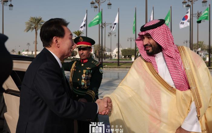 사우디아라비아를 국빈 방문 중인 윤석열 대통령은 22일(현지시간) 오후 리야드 야마마 궁전에서 모하메드 빈 살만 빈 압둘아지즈 알 사우드(이하 모하메드) 사우디아라비아 왕국 왕세자 겸 총리와 국빈 방문 일정을 갖고, 양국간 미래지향적 전략 동반자 관계를 심화·발전시켜