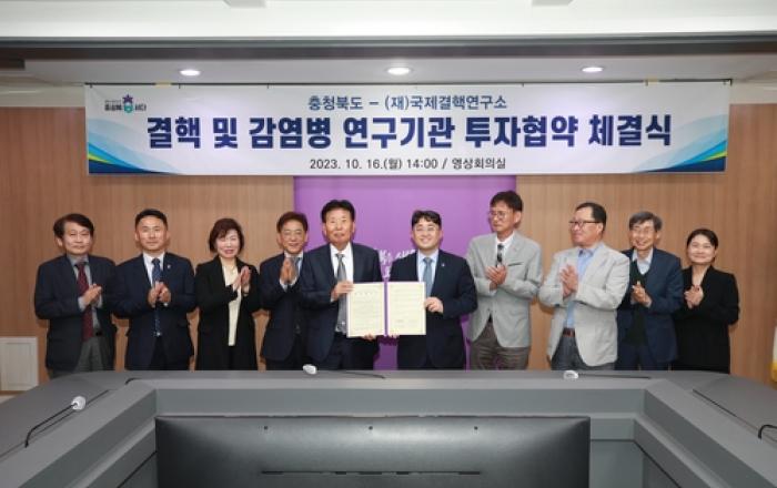 충청북도는 16일 도청에서 (재)국제결핵연구소와 오송첨복단지 내 10,335.2㎡, 300억 규모의 본소 이전을 위한 투자협약을 체결했다. 이날 협약식에는 김명규 경제부지사, 송선대 (재)국제결핵연구소 이사장 등 관계자 12명이 참석했다. 충북도는 연구소의 계