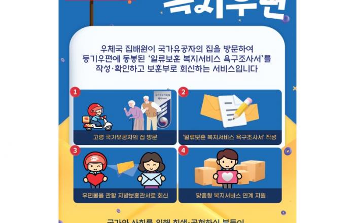 우체국 집배원이 국가유공자 자택을 방문해 필요한 복지서비스를 파악하면 국가보훈부가 이에 신속 대응하는 ‘일류보훈 복지우편서비스’가 도입된다. 보훈부는 오는 17일 오후 2시 세종 보훈부 청사에서 이 같은 서비스 도입을 위해 우정사업본부와 업무협약을 체결한다고 16일 밝