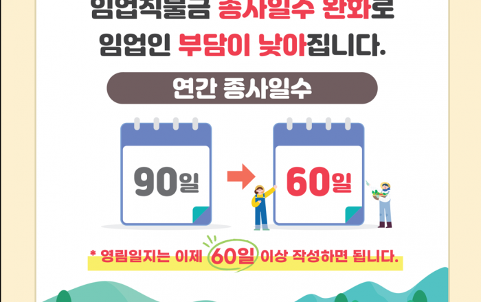산림청은 임업ㆍ산림 공익직접직불금(이하 ‘임업직불금’) 지급대상자의 연간 종사일수 기준을 완화하는「임업ㆍ산림 공익기능 증진을 위한 직접지불제도 운영에 관한 법률 시행규칙(이하 ‘임업직불제법 시행규칙’)」일부개정령을 10월 16일 공포ㆍ시행했다고 밝혔다.