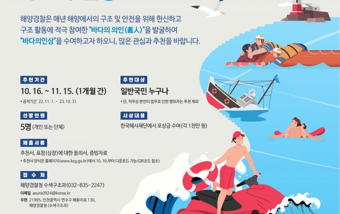 해양경찰청은 16일부터 오는 11월 15일까지 “2023년 바다 의인상”후보를 공모한다고 밝혔다. “바다 의인상”은 해양경찰청과 한국해사재단이 매년 해양에서 자신의 목숨과 위험을 무릅쓰고 다른 사람의 생명, 신체 또는 재산을 구하기 위해 헌신한 “바다의 의인(義人)