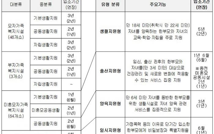 여성가족부는 12일부터 전국 122개 한부모가족복지시설(이하 ‘한부모시설’) 운영 방식을 이용자 중심으로 전면 개편한다고 밝혔다. 이에 그동안 복잡했던 시설 유형을 지원기능과 자녀발달 기준에 맞춰 개편하고, 현장 애로사항 반영은 물론 입소기간 연장과 종사자 증원도 추진