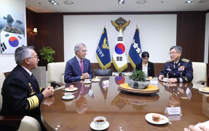 해양경찰청-에콰도르 해군, 한자리에 모여 해양안보와 국제협력 시너지 극대화에 나선다 해양경찰청은 12일 “존 메를로 레온 에콰도르 해군 참모총장이 해양경찰청(인천 송도)을 방문하여 양국 간 업무 협력 강화를 위한 ‘해양안보협력 약정(MOU)’을 체결했다
