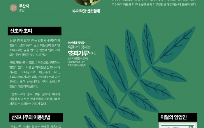 산림청은 매월 적극행정 추진을 위해 대표 임산물의 효능과 효과, 조리법 등을 소개하여 임산물의 우수성을 알리고, 올바른 임산물 구매를 안내하는 ‘이달의 임산물’ 시리즈를 추진하고 있다. ‘이달의 임산물’ 시리즈는 산림청 블로그에서 만나 볼 수 있다.