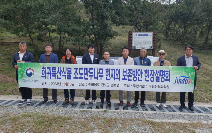 산림청 국립산림과학원은 6일(금), 진도군에서 국립수목원과 함께 희귀특산식물 조도만두나무의 현지 외 보존 방안 모색을 위한 현장설명회를 실시하였다. 1983년 진도군 조도면에서 처음 발견된 조도만두나무는 한반도에서만 자생하는 1속 1