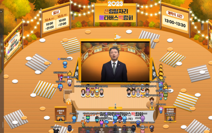산림청은 청년들에게 산림분야 취업·창업 상담과 산림일자리 정보를 제공하는 ‘2023년 산림일자리 확장 가상 세계(메타버스) 박람회’ 개막식이 가상 공간(젭) 속 광장에서 10월 4일 오후 1시에 열렸다고 밝혔다. 이날 개막식은 산림청 남성