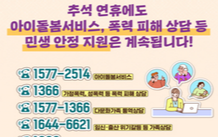 여성가족부는 추석 연휴 기간에도 아이돌봄서비스를 휴무 없이 정상 운영하고 평일 기준 요금을 적용한다고 26일 밝혔다. 또한 여성긴급전화·청소년상담전화·가족상담전화를 24시간 운영하고 청소년쉼터, 해바라기센터를 개방하는 등 민생 서비스를 차질 없이 지원하기로 했다.