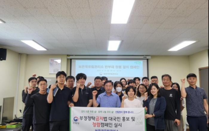 보은국유림관리소가 18일 산불대응센터 회의실에서 전직원이 모두 참여한 가운데 반부패·청렴 결의를 다지는 시간을 가졌다고 밝혔다. 보은국유림관리소 보호·산사태대응팀 소속 이용석 주무관과 이현희 주무관은 관리소장 앞에서 반부패·청렴서약서를 낭독하며 맡은 바