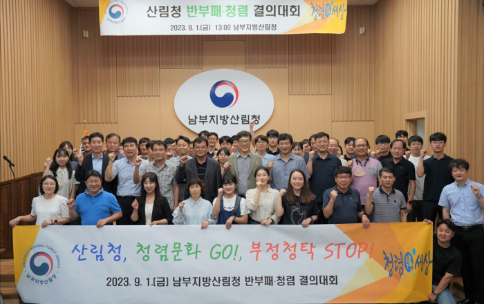 남부지방산림청은 9.1.(금) 13:00에 공직사회 반부패 척결과 조직 내 청렴인식 제고를 위하여 “2023년 청렴·반부패 및 갑질근절 결의대회”를 개최하였다. 해당 결의대회는 5개 국유림관리소장이 참석한 가운데, 각 과 및 관리소 민원대응 담당자들과 인력관리
