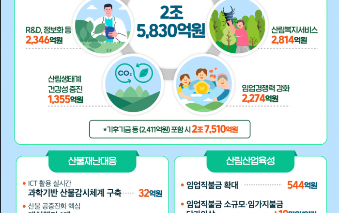산림청은 내년도 예산안이 올해 대비 4.0%(+993억 원) 증가한 2조 5,830억 원 규모이며, 기후대응기금(1,622억 원) 등에 포함된 산림분야 사업을 더하면 총 재정지출 규모는 2조 7,510억 원이라고 밝혔다. 분야별로는