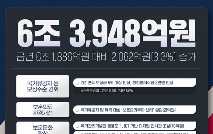 정부가 국가를 위해 희생·헌신한 국가유공자에 대해 2년 연속 보상금을 5% 이상 인상하고 참전명예수당도 증액하는 등 보상 수준을 강화하고 사각지대 해소에 나선다. 또 국가유공자 및 유족을 대상으로 하는 ‘보훈트라우마 센터’ 설립을 추진해 보훈의료 환경을 개선하는 한편,