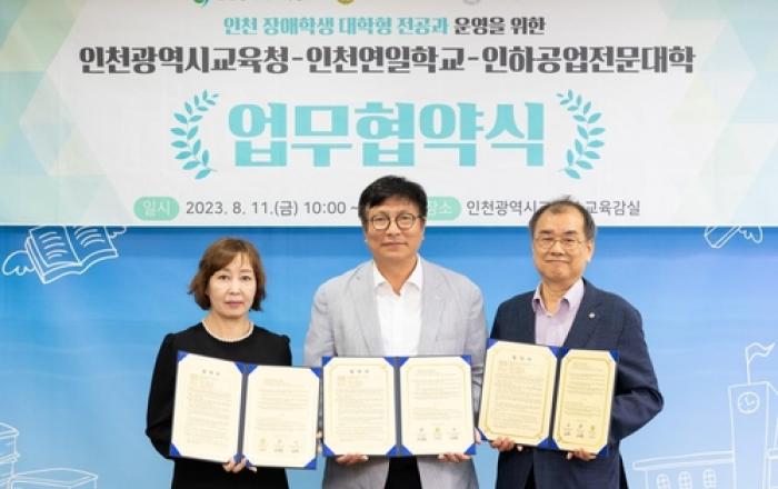 인천광역시교육청은 인하공업전문대학, 인천연일학교와 특수교육대상학생 전문직업교육 역량 강화를 위한 대학형 전공과 운영 업무협약을 11일 체결했다. 인천시교육청은 현재 인천재능대학교에 인천청인학교 전공과 4학급을 위탁 운영 중이다. 이번 협약으로 인천연일학교에 전공과