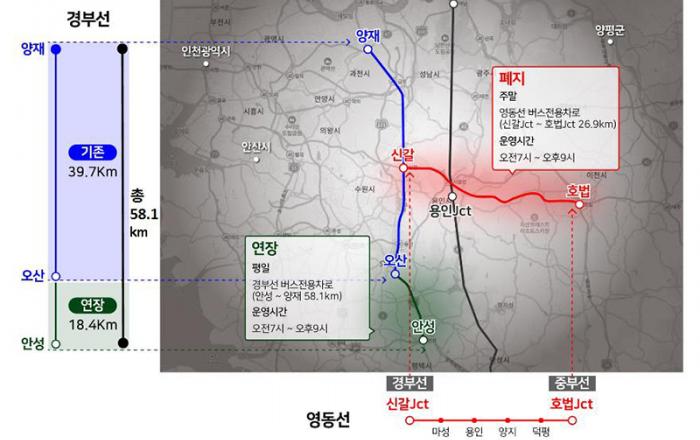 오는 6월부터 경부선 평일 버스전용차로 구간이 양재~오산에서 안성까지 연장된다. 국토교통부는 다음 달부터 경부고속도로와 영동고속도로의 버스전용차로 구간을 조정·시행한다고 28일 밝혔다. 현재 평일 양재나들목에서 오산나들목까지 운영 중인 경부선 버스