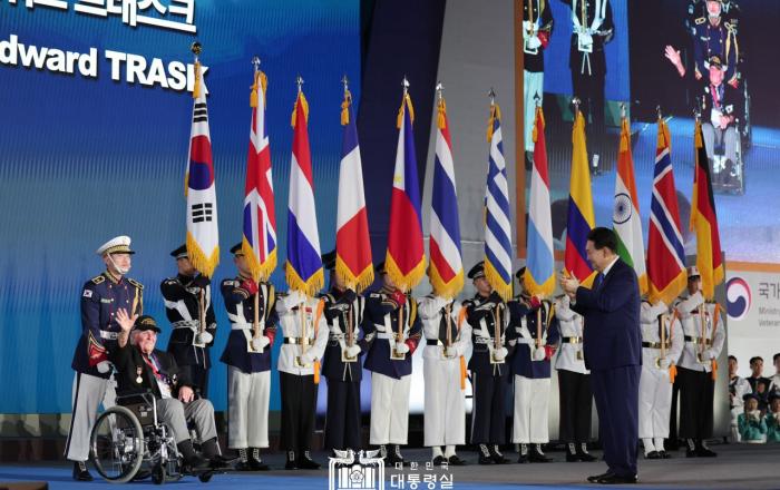 윤석열 대통령은 27일 “오늘의 대한민국은 유엔군의 희생과 헌신, 그리고 피 묻은 군복 위에 서 있다”면서 “대한민국은 위대한 영웅들을 영원히 기억할 것”이라고 강조했다. 윤 대통령은 이날 저녁 부산 영화의 전당 야외극장에서 개최된 ‘유엔군 참전의날·정전협정 70주년