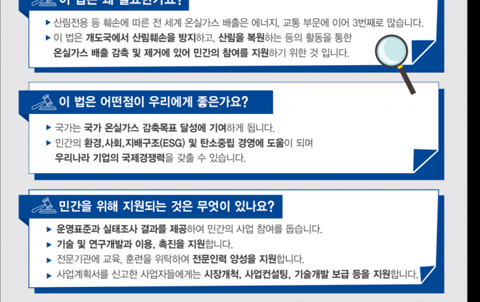 산림청은 7월 27일 「개발도상국 산림을 통한 온실가스 배출 감축 및 탄소 축적 증진 지원에 관한 법률」(“국외산림탄소배출감축법”) 이 국회 본회의를 통과했다고 밝혔다. 이 법률은 개발도상국들의 제안으로 파리협약 제5조에 반영된 국외산림탄소배출감축