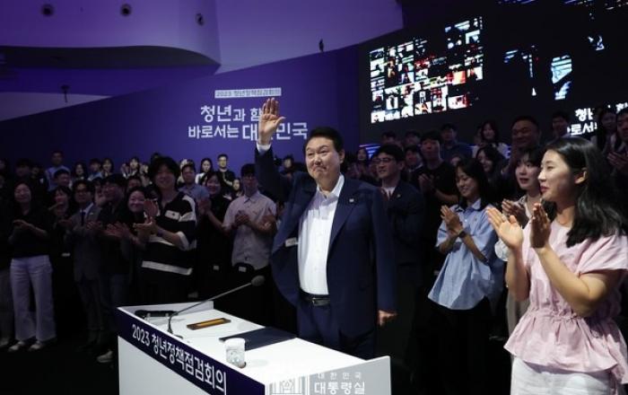 윤석열 대통령은 6일 오후 서울 서초구 플로팅아일랜드 컨벤션홀에서 ‘청년정책 점검회의’를 주재하고, 대한민국 청년의 현재와 미래에 대한 의견을 교환했다. 이날 회의는 ‘청년과 함께 바로 서는 대한민국’을 부제로, 중앙과 지방 청년정책조정위원회 위원, 각 부처 청년보좌역