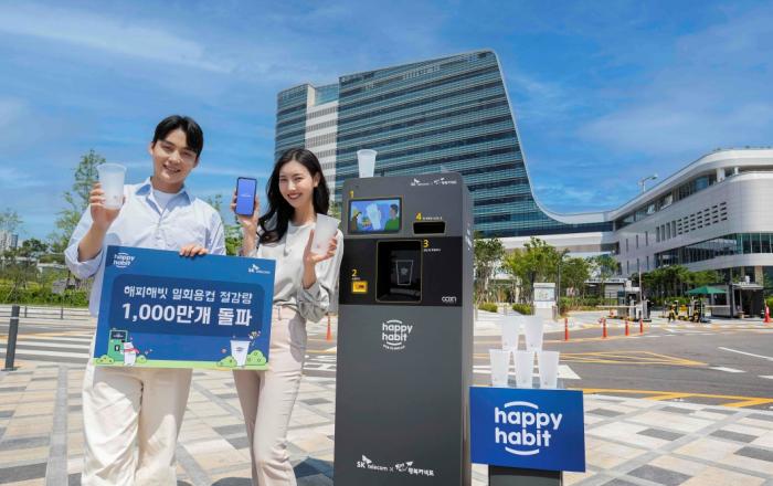 SK텔레콤은 ICT 솔루션 기반의 다회용 컵 순환 캠페인 ‘해피해빗’이 시행 2년만에 일회용 컵 1천만개를 절감하는 성과를 통해 293톤의 탄소배출 저감 효과를 거뒀다고 20일 밝혔다. ‘해피해빗’ 캠페인을 운영하고 있는 ‘해빗에코얼라이언스(ha:bit eco all