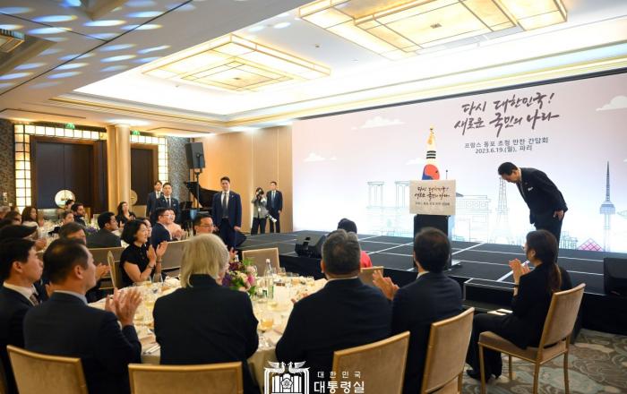 프랑스를 방문 중인 윤석열 대통령은 19일(현지시간) 동포들과 만찬 겸 간담회를 가지고 2030세계박람회 부산 유치를 위한 동포들의 지원을 요청했다. 윤 대통령은 만찬 간담회 격려사에서 “오는 11월에 에펠탑이라는 대표적인 박람회 유산을 자랑하는 이곳 파리에서 2