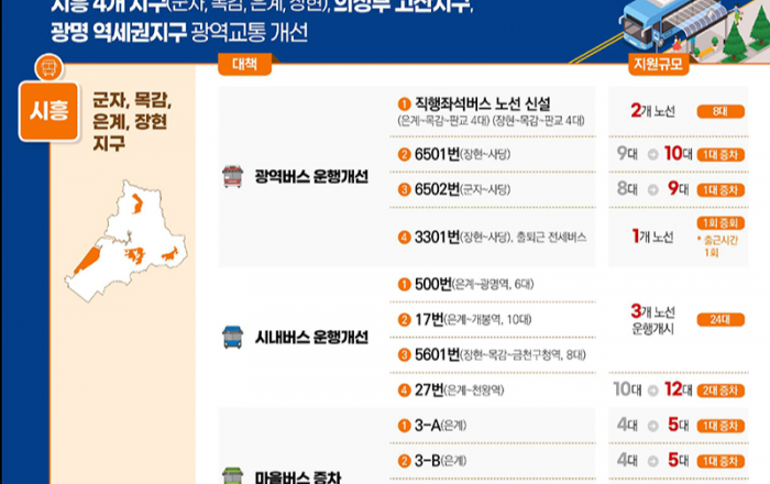 경기도 시흥·의정부·광명의 6개 집중관리지구에서 광역버스 노선이 신설되거나 광역버스가 늘어난다. 국토교통부 대도시권광역교통위원회(이하 대광위)는 1일 이 같은 내용의 6개 집중관리지구 광역교통 단기 보완대책을 발표했다. 우선 시흥권 4개 지구(군자·목감·은계·장현)에서