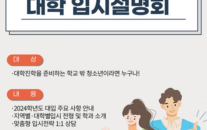 대학 진학을 희망하는 학교 밖 청소년을 위한 대학 입시설명회와 맞춤형 상담이 진행된다. 여성가족부는 이달부터 오는 11월까지 ‘2024학년도 대입 설명회 및 1대1 맞춤형 상담’을 실시한다고 25일 밝혔다. 지난해에는 16개 시·도 학교밖청소년지원센터에서 대입 설