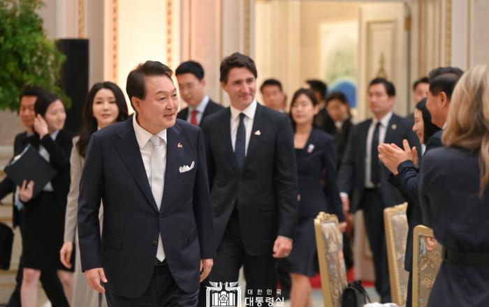 윤석열 대통령 부부는 17일 한-캐나다 정상회담이 끝난 후 청와대 영빈관으로 저스틴 트뤼도 총리를 초청해 만찬을 가졌다. 만찬 자리에서 윤 대통령은 “양국이 더욱 강력하게 협력해서 미래로 나아가자는 뜻”이라며 ‘Stronger together!’라고 건