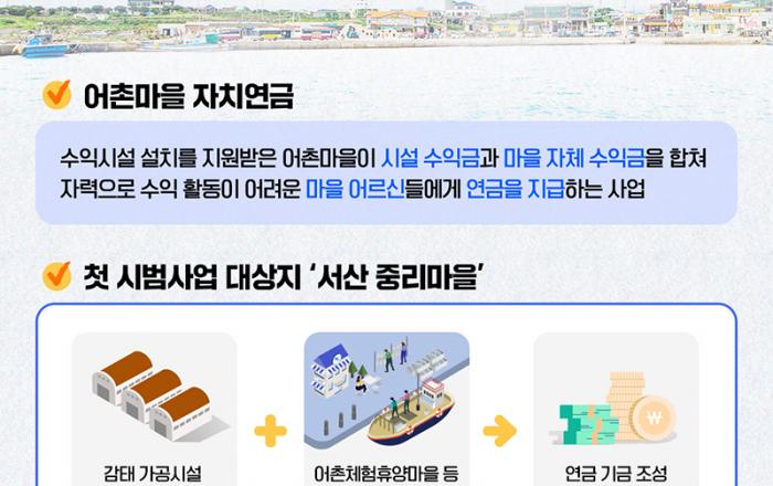 해양수산부는 ‘어촌마을 자치연금’ 시범사업 대상지인 서산 중리마을이 감태 가공으로 발생한 수익금을 활용해 이달부터 만 78세 이상 마을 주민 24명에게 월 10만 원씩 연금을 지급한다고 10일 밝혔다. 어촌마을 자치연금은 수익시설 설치를 지원받은 어촌마을이 수익금과 마