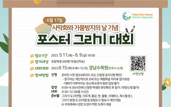 산림청은 국제연합(UN)이 정한「사막화와 가뭄 방지의 날」 기념행사(경남수목원, 6.15)의 하나로 실시될 포스터 그리기 대회(초등생)와 영어발표 대회(중·고생) 접수를 5월 11일(목)부터 시작한다고 밝혔다. * 사막화방지협약 채택(’94.6.17,