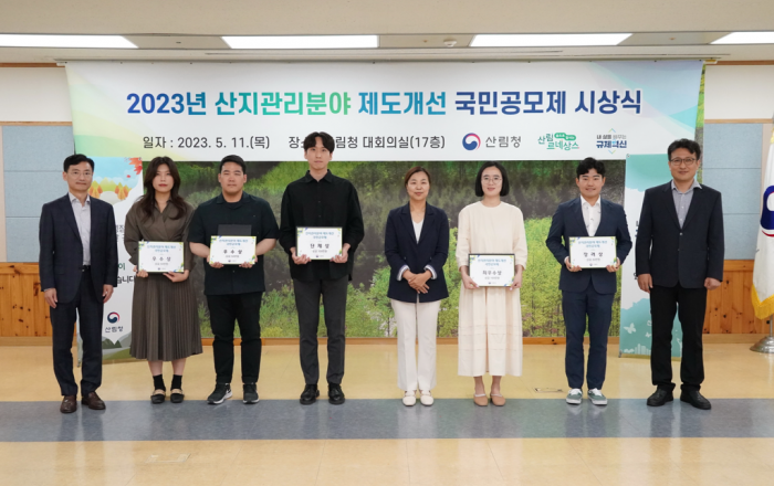 산림청은 11일 산지관리분야 제도개선 국민 공모제로 선정된 우수과제 제안자 7명과 1개 기관에 대해 산림청장 상장과 함께 포상금을 지급하였다. * 산림청장 상장 및 포상금 수여: 총 420만 원(최우수 100, 우수 각 50, 장려 각 30, 단체 1