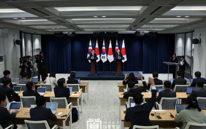 윤석열 대통령은 7일 한일 정상회담 공동기자회견을 통해 “우리 두 정상은 한일관계 개선이 양국 국민에게 큰 이익으로 돌아온다는 점을 확인하고, 앞으로도 더 높은 차원으로 양국 관계를 발전시켜 나아가는 데 합의했다”고 밝혔다. 윤 대통령은 이날 오후 서울 용산 대통령실