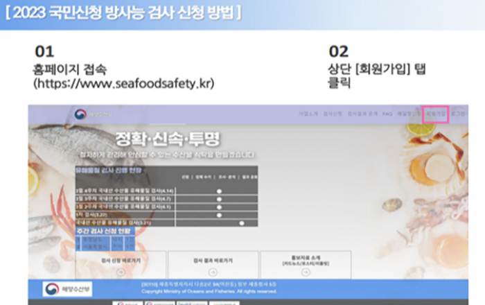 최근 일본의 원전 오염수 해양 방류 예정 등으로 수산물 안전과 방사능 안전성 검사에 대한 국민 관심이 높아짐에 따라 해양수산부가 국민이 직접 방사능 검사 품목을 선정할 수 있도록 한다. 24일 해수부에 따르면, 국민이 직접 방사능 검사를 원하는 수산물을 신청할 수 있도