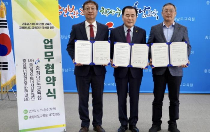 충남교육청은 19일 ㈔충남기후에너지시민재단, 충남에너지협동조합연대와 에너지 절약과 재생에너지 생산·활용, 에너지 전환교육을 확대해나간다. 이번 협약에 참여한 3개 기관(단체)은 ▲탈석탄, 재생에너지 확대, 에너지 전환을 위한 교육 및 프로그램 개발·보급(강사 및 환