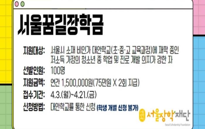 서울장학재단이 교육지원이 부족한 학교 밖 청소년들도 꼼꼼하게 지원 혜택을 받을 수 있도록 초·중·고 비인가 대안학교에 재학 중인 청소년을 대상으로 '서울꿈길 장학금'을 지원한다. '서울꿈길 장학금'은 학업에 대한 의지가 강한 학교 밖 청소년 100명에게 학업