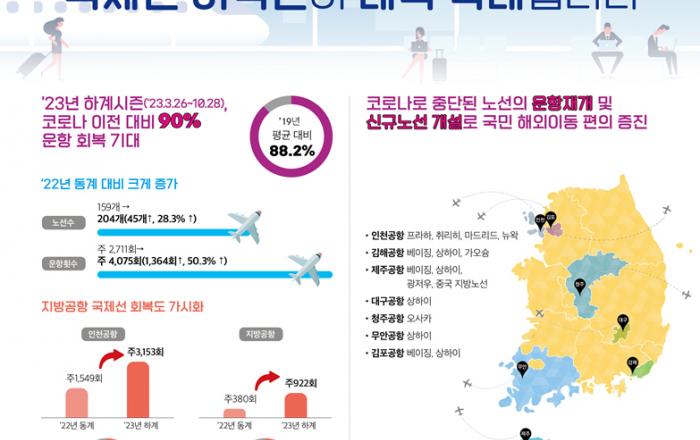 정부가 올해 9월까지 국제선 운항횟수를 코로나19 사태 이전인 2019년의 약 90% 수준까지 회복하겠다는 목표를 세웠다. 국토교통부는 오는 9월 204개 국제선의 정기편 노선을 주 4075회를 운항할 계획이라고 2일 밝혔다. 이는 2019년의 88.2% 수준이다. 지