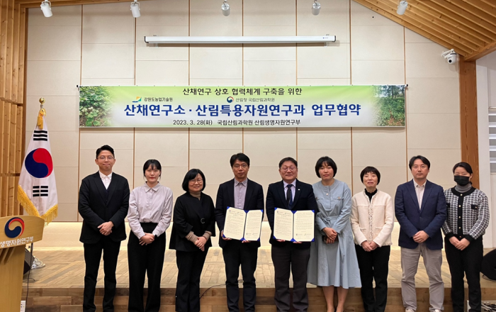 산림청 국립산림과학원은 강원도농업기술원 산채연구소과 ‘산지재배 특화 산채의 새로운 소득원 발굴 및 소재화 연구 분야’의 상호협력을 위하여 28일 산림과학원 산림생명자원연구부에서 업무협약(MOU)을 체결했다고 밝혔다. 이번 협약의 주요 내용은 ▲산채