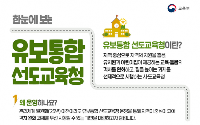 정부가 유보통합 선도교육청을 통해 아이들의 격차 없는 성장을 지원한다. 교육부는 출생부터 국민안심 책임교육·돌봄을 위한 유보통합의 첫걸음으로 유치원과 어린이집 간 교육·돌봄 격차완화 과제를 수행하는 ‘2023년 유보통합 선도교육청’을 추진한다고 13일 밝혔다. 이주호