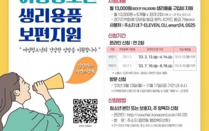 포천시는 여성청소년의 건강권 보장 및 권익증진 실현을 위해 '2023년 여성청소년 생리용품 보편지원' 신청 접수를 이번 달 13일부터 시작한다. 이번 사업의 대상자는 포천시에 거주하는 만 11세~18세 여성청소년('05~'12년생)이다. 상반기 온라인 신청은 오는