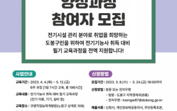 서울 도봉구가 전기시설 관리 분야로 취업을 희망하는 구민들을 위해 전기기능사 자격증 취득 대비 교육과정(필기시험)을 운영한다고 밝혔다. '도봉구민 전기시설 관리자 양성과정'은 시설·건물 관리 분야의 구인 업체 증가와 구직자 수요 증가 그리고 시설 관리에 전기시설 전
